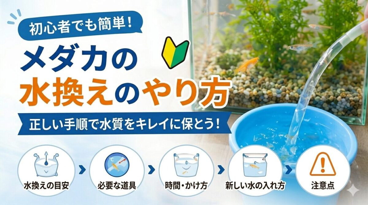 メダカを飼育していると、水の中には少しずつ有害物質が溜まっていきます。正しい水換えの頻度・量・手順を守るだけでメダカが病気になりにくくなります。この記事では屋外飼育歴3年の筆者が水換えの基本から注意点まで詳しく解説します。